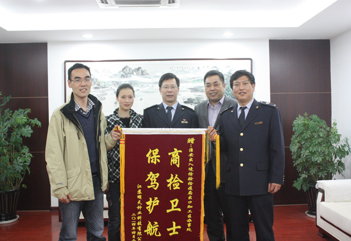 4月3日,公司常務副總刁陽隆、雜交水稻部部長蔣銀濤等一行人來到淮安市出入境檢驗檢疫局,向該局送去繡有“商檢衛士,保駕護航”的大紅錦旗,對檢驗檢疫部門一直以來為我公司提供高效、優質的服務支持表示深深的感謝!