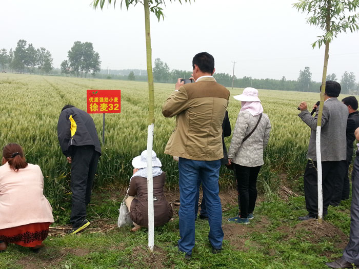 徐麥32:原名“徐麥7049”,由江蘇徐淮地區徐州農業科學研究所以淮麥18/周麥16選育而成的半冬性中熟小麥品種,2012年通過江蘇省審定,該品種株高只有73.9cm,是江蘇審定最矮的小麥新品種,既抗倒,又利于收割,今年淮北區域小麥大面積發生倒伏,徐麥32在各地均無倒伏;徐州、連云港一帶紋枯病大爆發,徐麥32基本無發生;抗倒和抗病表現相當優異。另外徐麥32品質優良,在觀摩期間也受到了眾多糧食收購企業和專用粉加工企業的跟蹤關注,對今年種植面積較大的徐麥32商品糧每斤都加價5-8分錢進行收購,不光穩產、還能增收,這非常適應未來蘇北土地扭轉后種田大戶種植。