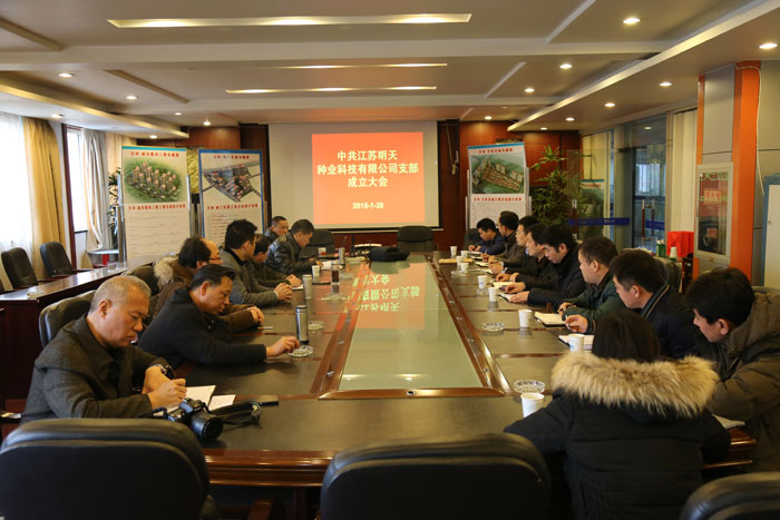 2015年1月28日,中共江蘇明天種業科技有限公司支部成立大會在江蘇天坤集團公司會議室召開,會議宣讀了中共丹陽開發區工委、江蘇天坤集團黨委《關于中共江蘇明天種業科技有限公司黨支部批準成立的批復》,江蘇天坤集團總裁張立民、副總裁馬海強、丹陽開發區工委組織人事局吳志江副局長、公司黨支部11名黨員,1名入黨積極分子共同出席了此次會議。會議由集團副裁馬海強主持。