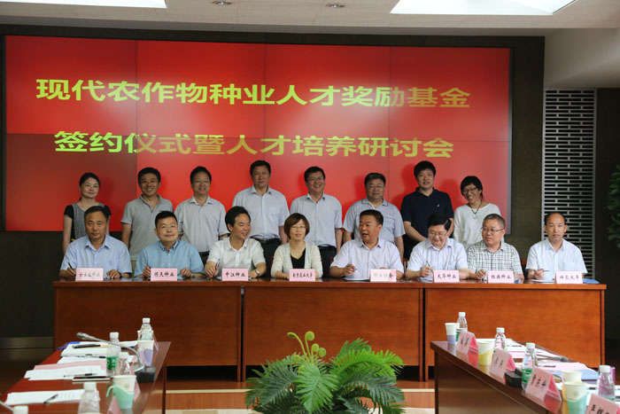 2015年7月15日,公司總經(jīng)理嚴(yán)輝民赴南京農(nóng)業(yè)大學(xué)農(nóng)學(xué)院參加了“現(xiàn)代農(nóng)作物種業(yè)人才獎(jiǎng)勵(lì)基金”簽約儀式暨人才培養(yǎng)研討會(huì)。經(jīng)過充分討論,會(huì)上形成《江蘇省現(xiàn)代農(nóng)作物種業(yè)人才獎(jiǎng)勵(lì)基金管理辦法》,并簽訂《關(guān)于設(shè)立江蘇省“現(xiàn)代農(nóng)作物種業(yè)人才獎(jiǎng)勵(lì)基金”的捐贈(zèng)協(xié)議書》,與會(huì)人員還就種業(yè)人才培養(yǎng)的議題展開了廣泛的討論,會(huì)議圓滿成功。南京農(nóng)業(yè)大學(xué)副校長丁艷鋒、江蘇省種子管理站副站長湯義華、南京農(nóng)業(yè)大學(xué)農(nóng)學(xué)院院長朱艷等出席了此次會(huì)議。 為貫徹落實(shí)江蘇省政府《關(guān)于加快推進(jìn)現(xiàn)代種業(yè)發(fā)展的實(shí)施意見》精神,加快培養(yǎng)適應(yīng)我省現(xiàn)代種業(yè)發(fā)展的高層次人才,由江蘇省種業(yè)協(xié)會(huì)、南京農(nóng)業(yè)大學(xué)農(nóng)學(xué)院、江蘇明天種業(yè)科技有限公司及省內(nèi)幾家種業(yè)企業(yè)共同發(fā)起設(shè)立江蘇省現(xiàn)代農(nóng)作物種業(yè)人才獎(jiǎng)勵(lì)基金。設(shè)立本基金的主要目的是鼓勵(lì)種業(yè)企業(yè)科研育種人員不斷提高業(yè)務(wù)能力,激發(fā)在校學(xué)生投身現(xiàn)代種業(yè)的熱情,吸引人才向種業(yè)企業(yè)流動(dòng)。 江蘇明天種業(yè)科技有限公司作為江蘇種業(yè)創(chuàng)新聯(lián)盟理事長單位,嚴(yán)輝民總經(jīng)理代表公司發(fā)言,認(rèn)為該基金的設(shè)立,在全國種業(yè)界,具有開創(chuàng)先河的重大意義,必將影響深遠(yuǎn),從而我公司會(huì)積極投身此項(xiàng)公益事業(yè)。嚴(yán)總還就種業(yè)專業(yè)拔尖復(fù)合型人才的培養(yǎng)目標(biāo)和基本思路、校企合作進(jìn)行人才培養(yǎng)的主要形式和內(nèi)容等問題進(jìn)行了深入的發(fā)言,同時(shí)誠摯歡迎熱愛種業(yè)行業(yè)的高等院校優(yōu)秀畢業(yè)生到我公司進(jìn)行實(shí)習(xí)和就業(yè)。