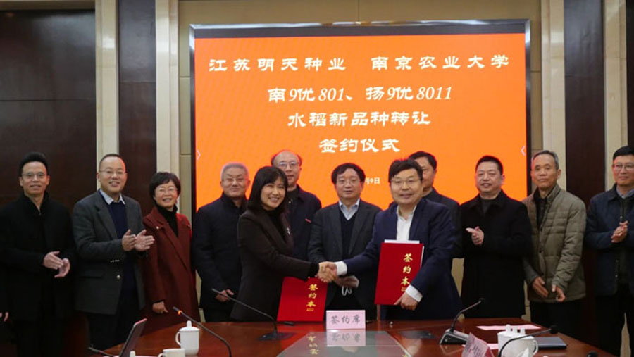 20231月9日,江蘇明天種業科技股份有限公司分別與南京農業大學、連云港市農業科學院在南京農業大學金陵研究院和公司會議室,就萬建民院士團隊秈稻品種最新成果9優8019優8011及江蘇明天種業與連云港市農科院聯合選育的粳稻新成果連粳307”隆重舉行轉讓簽約儀式江蘇明天種業成功簽約三品種全國獨占實施許可經營權。江蘇省農業農村廳、南京農業大學連云港市農科院等領導、專家到會見證。